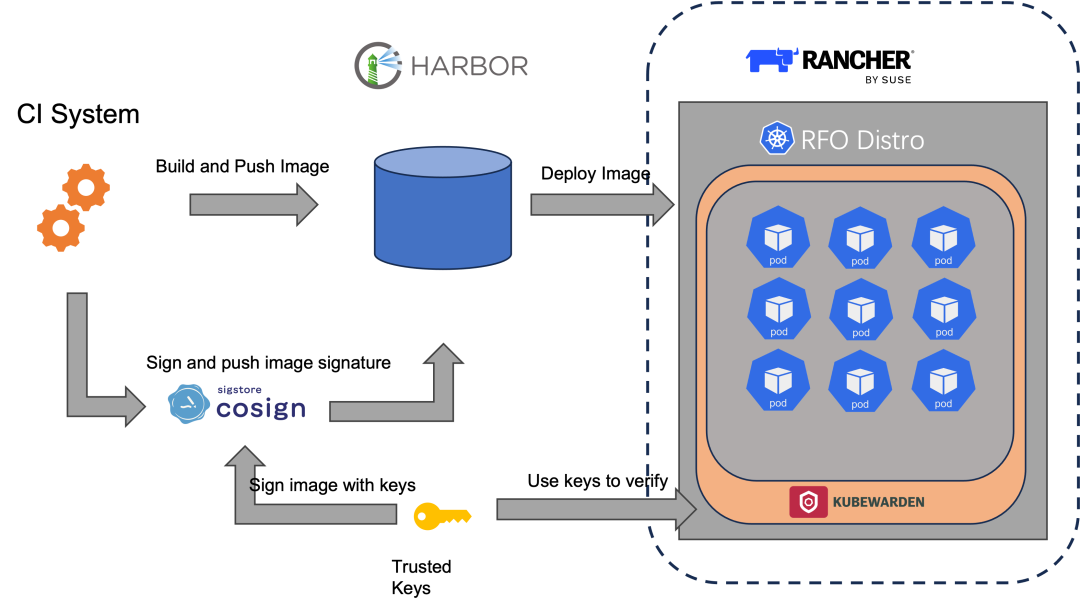 本次使用 Harbor + cosign + Kubewarden 的组合,对容器镜像进行存储/签名/验证操作,cosign 与 harbor v2.5.0+版本有较好的兼容性,能直接在 harbor UI 上看到 cosign 证书配置。经测试 Harbor v2.1.1 版本也可使用 cosign 进行签名,只是 Harbor UI 上显示不太直观。