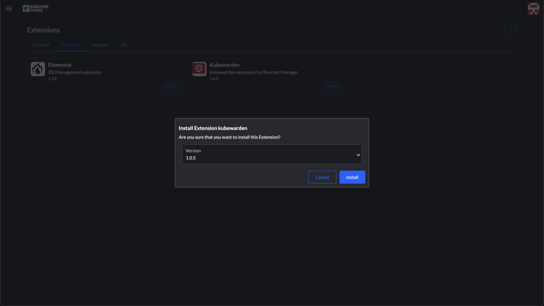 首先,我们需要在 Rancher 开启 extension 以及安装 Kubewarden 插件,从左侧菜单进入 Configuration
