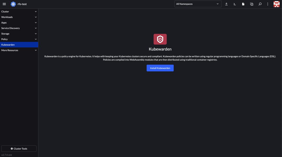 安装成功后,刷新页面,并进入下游 RFO 集群管理页面,左侧菜单出现 Kubewarden