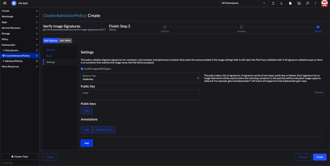 下添加我们的证书公钥,内容可以在cosign 创建签名密钥 中找到。输入完成后,点击 Finish 创建完成。