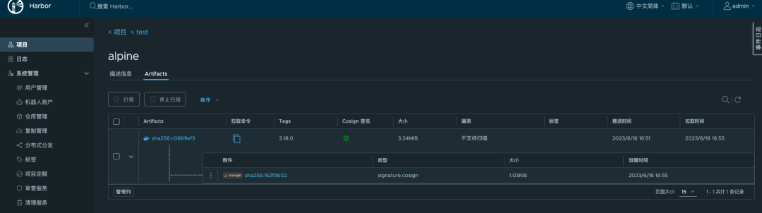 签名完成后,可以登录到 Harbor,查看该镜像的签名情况: