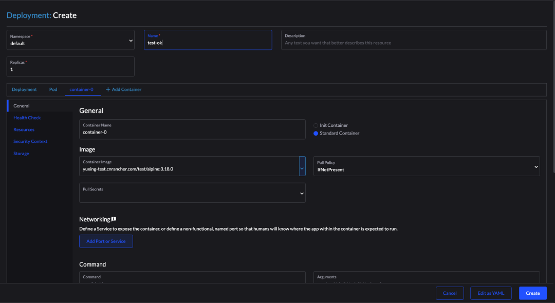 我们在 Rancher UI 上,进入集群管理页面,使用 yuxing-test.cnrancher.com/test/alpine:3.18.0