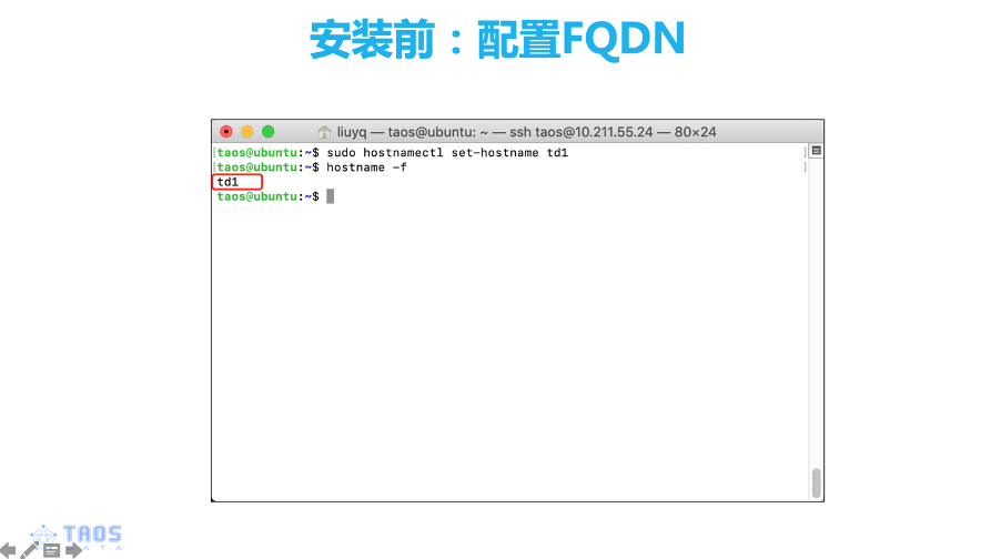 然后我们使用hostname -f来检查一下,可以看到,现在hostname已经被修改为td1了。
