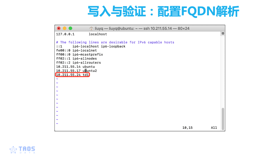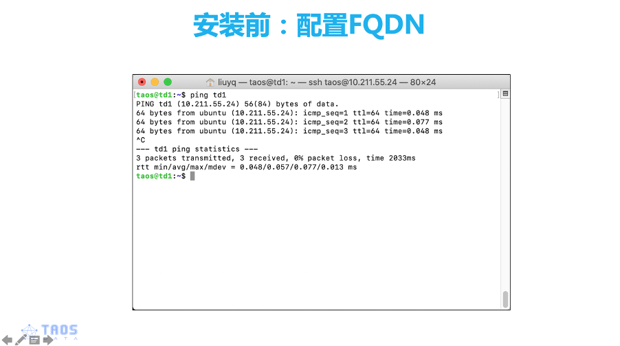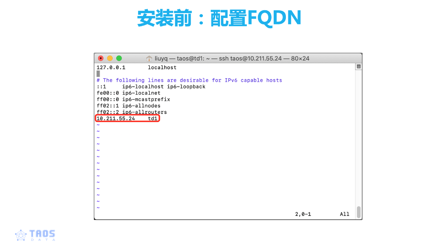 下载完成之后,我们首先进行FQDN配置,TDengine2.0之后使用FQDN作为节点名字的配置,而不是使用IP地址,因为在我们的生产环境,IP地址是有可能会发生变化的。