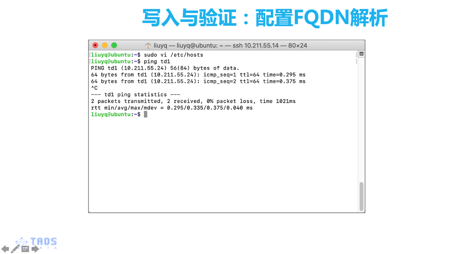 接着我们切换用户,让hostname生效。然后配置一下hosts文件,在hosts文件中我们需要添加一行(10.211.55.24 td1),10.211.55.24是我们这台服务器的IP地址,td1是我们刚才配置的hostname。