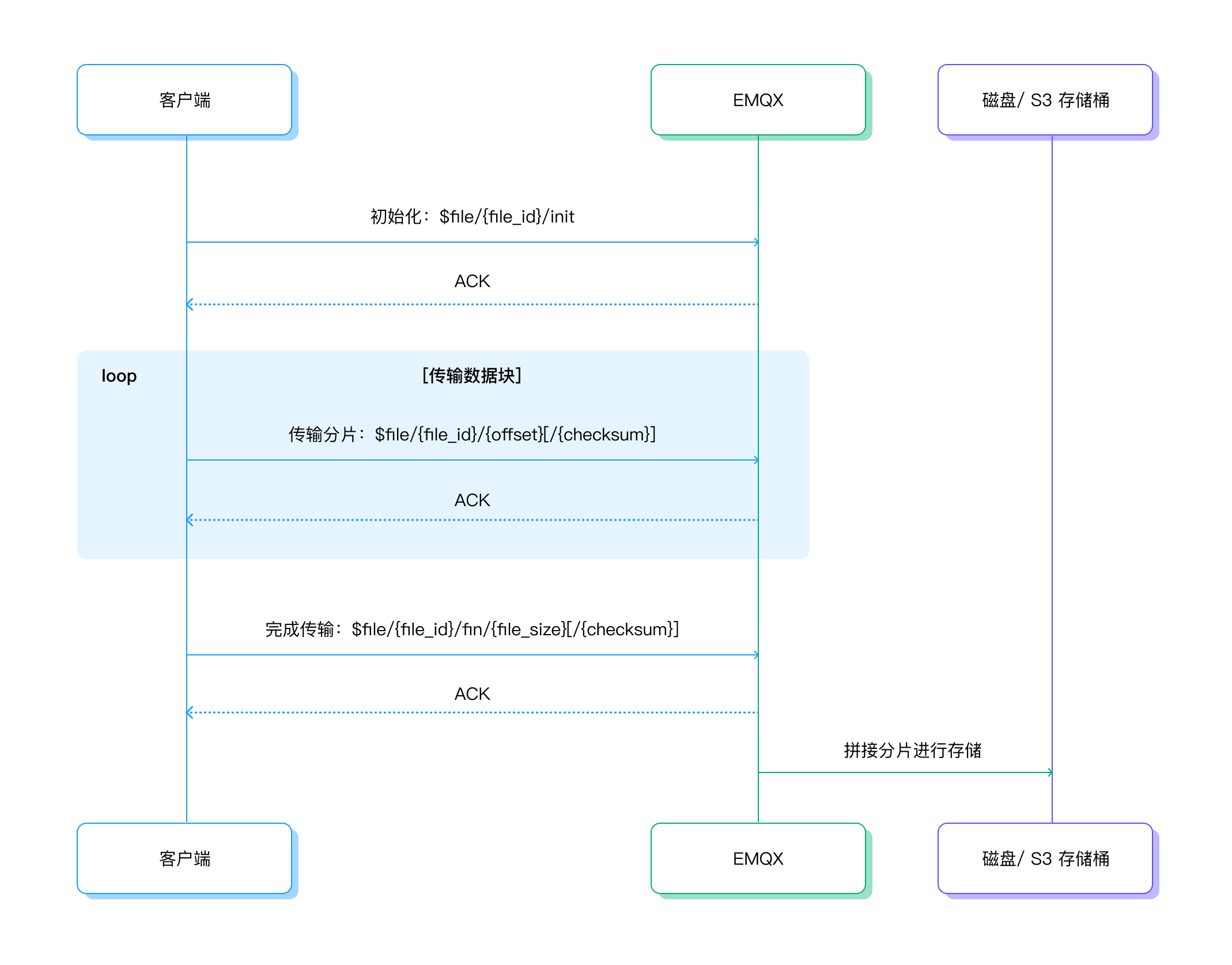 在协议层面,EMQX 文件传输基于标准的 MQTT 实现,通过指定的 MQTT 主题以及 Payload 实现整个传输流程,无需改造现有的客户端与应用即可进行集成。详细的传输协议请参考MQTT 文件传输客户端开发 https://docs.emqx.com/zh/enterprise/v5.1/file-transfer/client.html