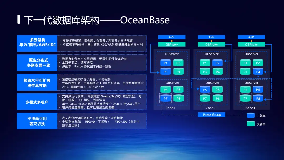 OceanBase 内部自动切换、无需人工干预和复杂决策流程,基于Paxos协议的典型多副本(三副本或以上)部署,能够实现数据强一致性、持续可用,主备自动切换,对上层业务透明。