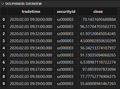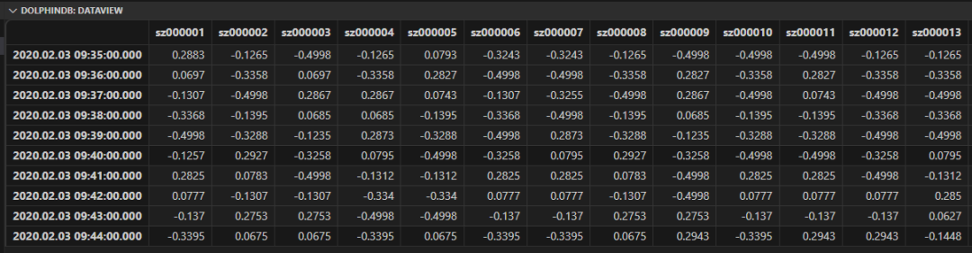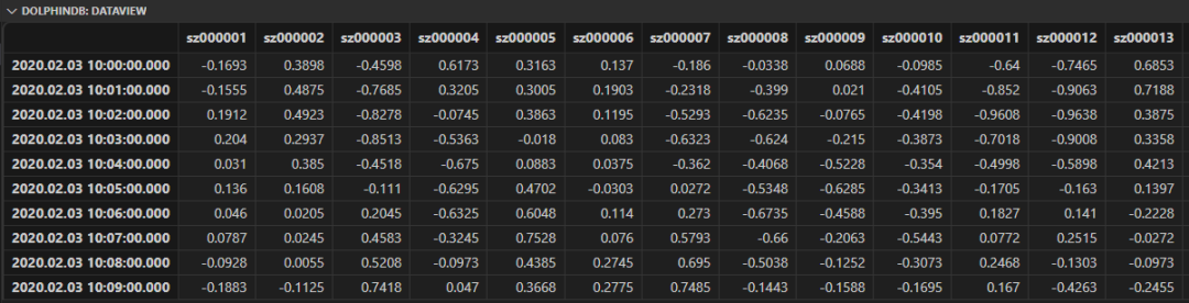同样基于前面的模拟原始数据,要计算4000只股票2020年2月份的分钟频 Alpha#1因子值,我们先用 select 语句生成如下数据表: