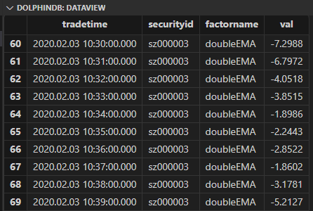 我们可以直接在 SQL 中通过 context by 子句按股票代码分组,然后在 select 中调用 factorDoubleEMA 因子计算函数,来计算每个股票在一段时间里的因子值。