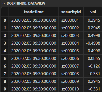def alpha1SQL(t){res = select tradetime, securityid, mimax(pow(iif(ratios(close) - 1 < 0, mstd(ratios(close) - 1, 20), close), 2.0), 5) as val from t context by securityidreturn select tradetime, securityid, rank(val, percent=true) - 0.5 as val from res context by tradetime}input_alpha1 = select tradetime,securityid,close from loadTable("dfs://k_minute_level","k_minute") where date(tradetime) between 2020.02.01 : 2020.02.28select top 10 * from input_alpha1alpha1DDBSql = alpha1SQL(input_alpha1)