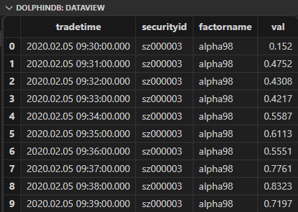 def prepareDataForDDBPanel(raw_data, start_time, end_time){t = select tradetime,securityid, vwap,vol,open from raw_data where date(tradetime) between start_time : end_timereturn dict(`vwap`open`vol, panel(t.tradetime, t.securityid, [t.vwap, t.open, t.vol]))}@statedef alpha98Panel(vwap, open, vol){return rowRank(X=mavg(mcorr(vwap, msum(mavg(vol, 5), 26), 5), 1..7),percent=true) - rowRank(X=mavg(mrank(9 - mimin(mcorr(rowRank(X=open,percent=true), rowRank(X=mavg(vol, 15),percent=true), 21), 9), true, 7), 1..8),percent=true)}raw_data_alpha98 = loadTable("dfs://k_minute_level","k_minute")start_time = 2020.02.01end_time = 2020.02.28input_panel_alpha98 = prepareDataForDDBPanel(raw_data_alpha98, start_time, end_time)alpha98DDBPanel = alpha98Panel(input_panel_alpha98.vwap, input_panel_alpha98.open, input_panel_alpha98.vol)
