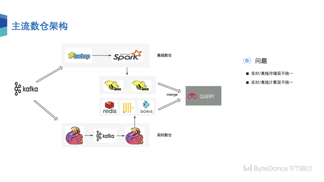 目前主流的数仓架构—— Lambda 架构,能够通过实时和离线两套链路、两套代码同时兼容实时数据与离线数据,做到通过批处理提供全面及准确的数据、通过流处理提供低延迟的数据,达到平衡延迟、吞吐量和容错性的目的。在实际应用中,为满足下游的即席查询,批处理和流处理的结果会进行合并。