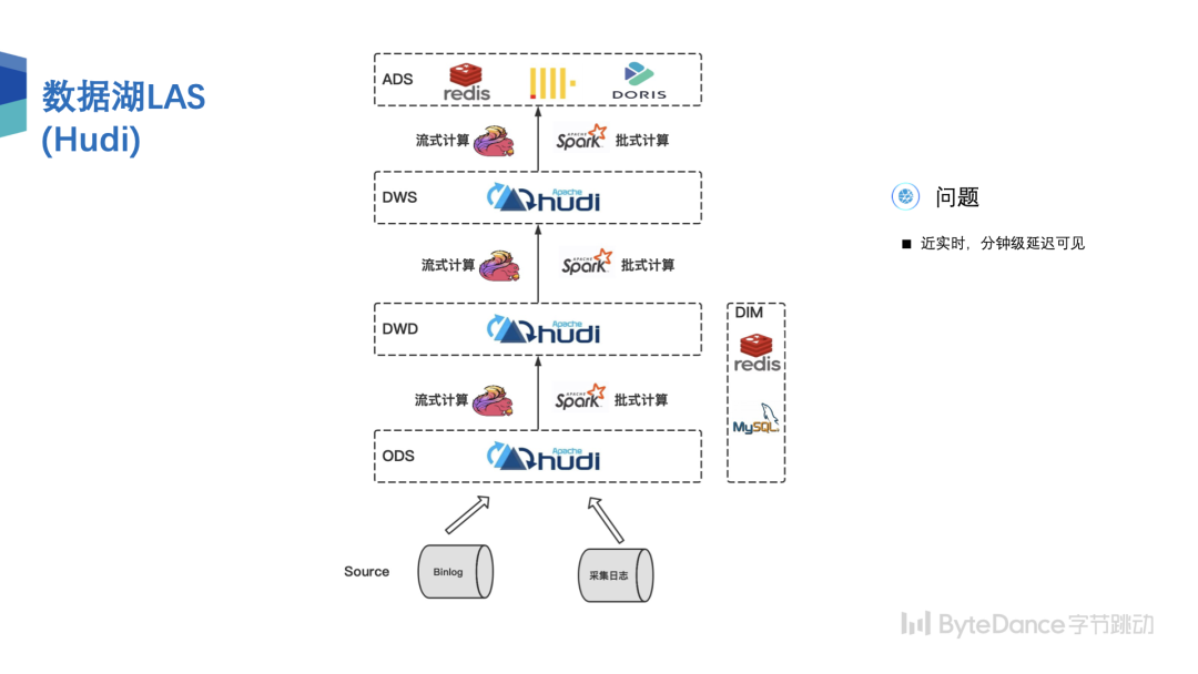 ● 职责边界清晰:流处理专注于增量数据计算,批处理专注于全量数据计算;● 容错性:批处理 T+1 全量计算的结果会覆盖流处理的结果,意味着流处理假如有异常、可以被批处理计算时修复;● 支持复杂性隔离:批处理的是离线就绪数据,可以很好的掌控。流处理采用增量方式处理实时数据,复杂性要高很多。通过分开批处理和流处理两套链路,把复杂性隔离到流处理,可以很好的提高整个系统的鲁棒性和可靠性。具有上述优点的同时,Lambda 架构同样存在一系列尚待优化的问题,涉及到计算、运维、成本等方面:● 实时与批量计算结果不一致引起的数据口径对齐问题:由于批量和实时计算走的是两个计算框架和计算程序,计算结果往往不同,经常出现一个数字当天查看的数据与第二天的不同,数据校准困难;● 开发和维护的复杂性问题:Lambda 架构需要在两个不同的 API 中对同样的业务逻辑进行两次编程:一次为批量计算,一次为流式计算。针对同一个业务问题产生了两套代码,形成了双倍的维护运维成本;● 资源成本问题:两套链路的存储介质不同、计算引擎也不同,会造成数据存储和资源翻倍。综上所述,主流数仓架构本质上有两个痛点:实时/离线计算层不统一;实时/离线存储层不统一。本文将聚焦于实时/离线存储层统一的实现能力上,希望能够有一套同时支撑实时场景下的增量处理和离线场景下的高效分析存储方案。/ 数据湖方案
