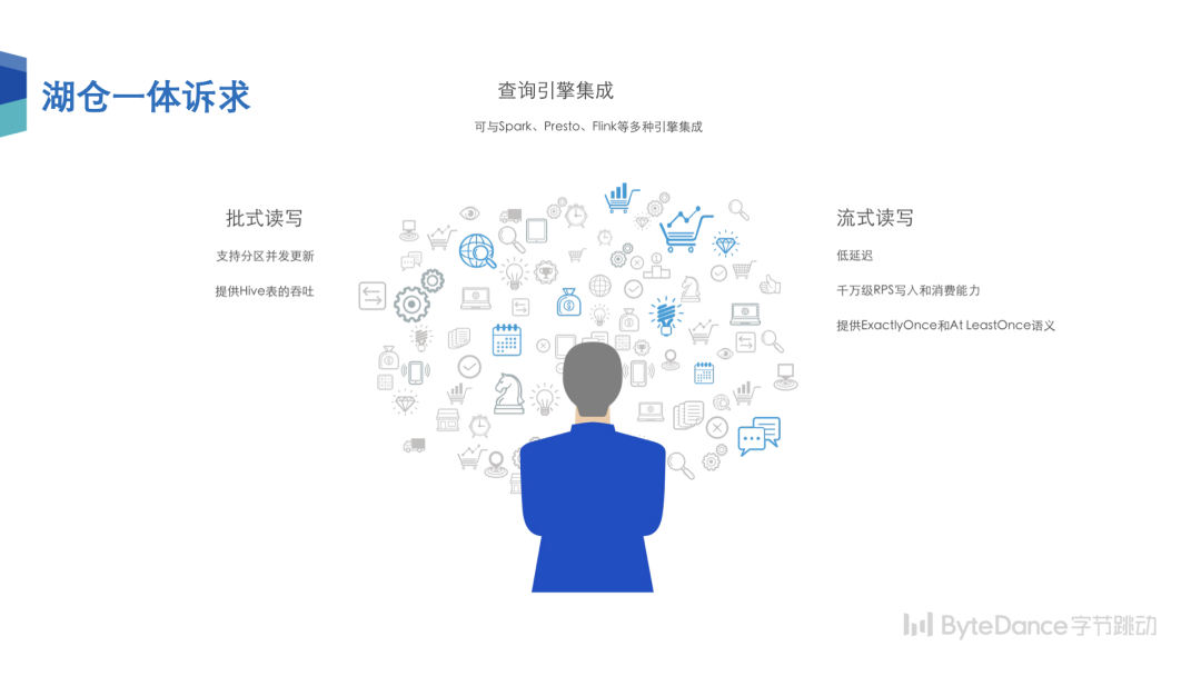 Hudi 作为数据湖框架的一种开源实现,其核心特性能够满足对于实时/离线存储层统一的诉求:● 支持实时消费增量数据:提供 Streaming Source/Sink 能力,数据分钟级可见可查;● 支持离线批量更新数据:保留原有 Hive 的 Insert 和 Overwrite 能力,并且提供对历史数据的更新删除能力 Upsert/Update/Delete;● 跟 Spark、Flink、Presto 等计算引擎集成比较好。尽管 Hudi 解决方案已经能够实现一份存储同时包含实时和离线两种场景,但由于数据的分钟级可见,它依然存在一定的优化空间,无法作为实时数仓存储的标准方案。/ 湖仓一体诉求