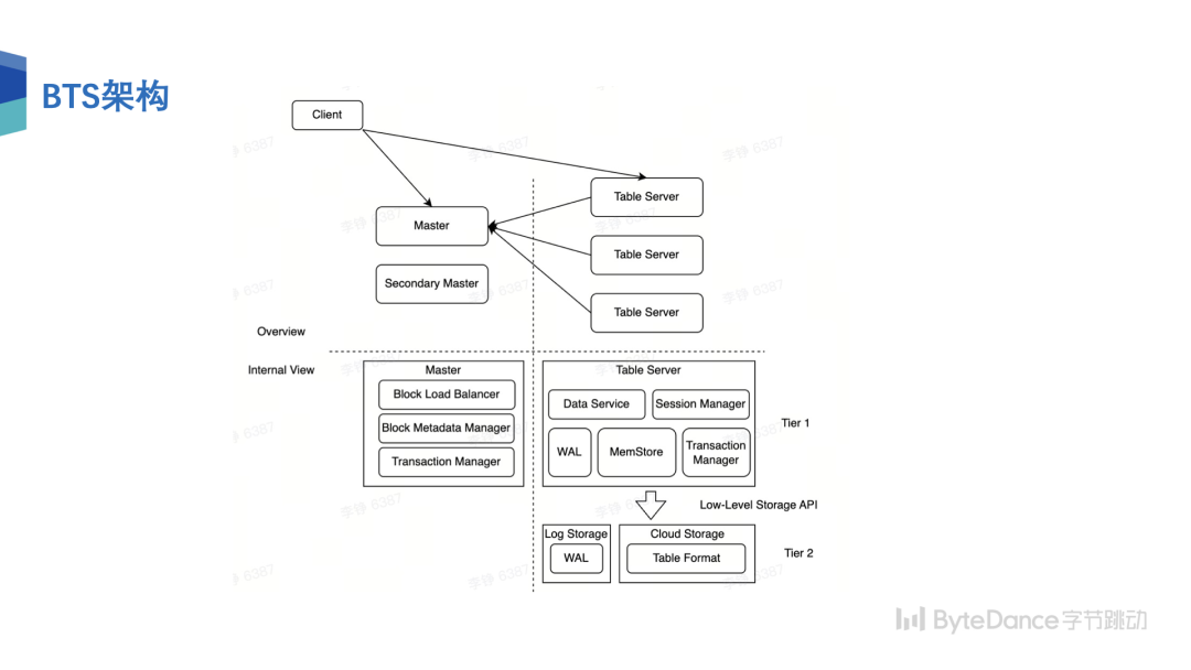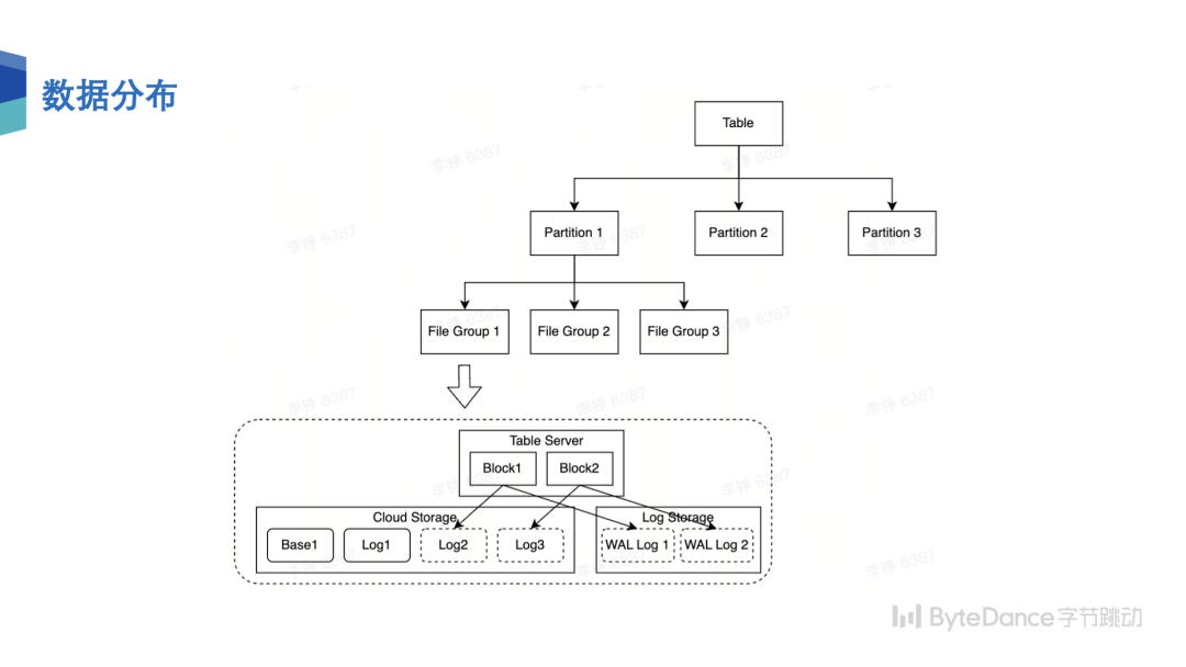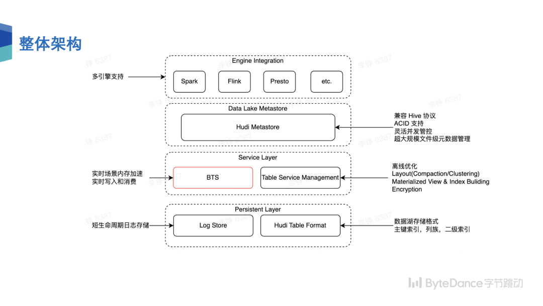 批流统一的湖仓一体存储需要满足更多的诉求,相匹配的就需要具备更强硬的核心能力,包括批式/流式读写能力与支持多种引擎的集成能力:批式读写提供不低于 Hive 表的吞吐,提供分区并发更新能力;流式读写能够端到端处理秒级低延迟,具备千万级 RPS 写入和消费能力,提供 ExactlyOnce 和 At Least Once 消费语义;支持多种引擎的集成能力,实现查询引擎集成化。我们针对以上需求,提出了更加高效的湖仓一体服务方案。接下来将从整体架构、数据分布、数据模型、数据读写以及 BTS 架构这 5 个方面,向大家介绍该方案的设计思路。为解决实时性问题,字节内部在数据湖上自研了基于内存的服务,形成了一套高吞吐、高并发、秒级延迟可见的实时数据湖方案。整体架构如下:架构底层为数据持久化层。复用 Hudi 的能力实现数据存储。文件分布和 Hudi 一致,通过列存的 base 文件与行存的 log 文件进行数据存储,基于时间戳维护数据版本。通过 filegroup 的方式对文件进行分组,相同逐渐的数据存储在同一个文件组内。后期结合数据构建索引能力,能够比较大幅度提升数据入湖和查询的性能。架构的第二层是元数据层。对数据湖的元数据进行管理,包括表、分区以及 instant、timeline、snapshot 等这些数据湖特有的元数据。在这一层不光实现了元数据的管理,还能够解决多并发写入的冲突检查和解决,保障 ACID 能力。架构的第三层是服务层。主要包含两个组件:BTS 和 TMS。BTS 是基于内存构建的服务层,通过内存加速数据读写操作,解决实时场景下数据生产消费的时效性问题。TMS 是聚焦在表优化的服务,会异步做一些 log 文件和 base 文件的compaction/小文件合并优化等操作。/ 数据分布