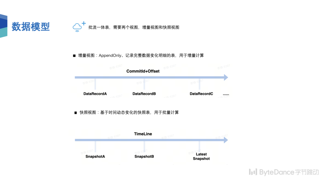 对于一张流批一体表,需要有两个视图,增量视图和快照视图:增量视图对应的是一张 Append Only、记录数据完整变化明细的表,用于实时增量计算。无主键表时,按照 CommitId+Offset 有序;有主键表时,按照 CommitId+Offset 有序,同一个 Key 可能会存在多条数据;快照视图对应的是一张给予时间动态变化的快照表,用于离线批量计算。无主键表时,按照 CommitId+Offset 有序,与增量视图等价;有主键表时,分区内 Key 是唯一的,只保存最新的数据;基于增量试图可以计算出快照视图。快照视图中数据已经基于主键做了合并,因此无法复现出增量视图。/ 数据读写