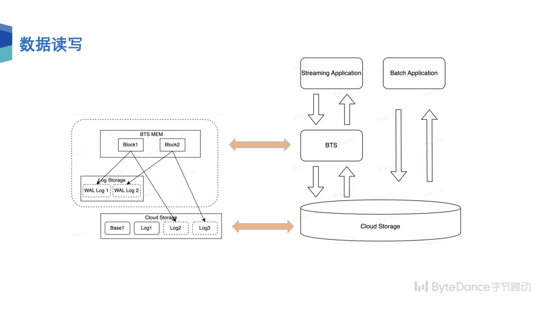 我们首先会基于流批的特性针对流批读写做负载分离。其中流作业延时敏感,吞吐稳定,通过 BTS 加速;批作业用于批量计算,注重吞吐,延迟不敏感,直接与底层文件存储交互。在流批负载分离的前提下,会做数据准确性保障。流批并发,写入时保障数据一致性;批数据写入时互不阻塞,同时保障流作业的低延迟和批作业的成功率。BTS 架构主要分为 BTS Master 与 BTS Table Server 两部分:BTS Master 由三部分组成。Block Load Balancer 为 Client 分配 Block,负责 Block 级别的负载均衡;Block Metadata Manager 负责管理 Block 与 TableServer 的关系元信息;Transation Manager 负责创建和提交分布式事务。BTS Table Server 由五部分组成。Session Manager 负责维护客户端的会话和配置信息,比如读写的 Offset 信息;DataService 提供数据读写 RPC 接口,提供列裁剪、谓词下推查询接口;Transaction Manager 提PreCommit 信息,如插入行数、Block 节点信息、Start-End Offset 信息等;MemStore 内含多表共用的内存区,管理内存分配和清理,管理Block生命周期。具备提供内存中快速查找、列裁剪、过滤、排序等能力;WAL 能够实现内存数据持久化,用于异常恢复。此外,在写缓存遭驱逐时,可用于数据读取。湖仓一体存储在不同场景下应用时展现出了不同的亮点,下面我们介绍三个经典场景:流式数据计算、实时多维分析、流批数据复用,以及在这些应用案例中可达成的收益。针对实时数仓的流式数据计算场景,实时数仓链路中的数据都在 Kafka 这种 MQ 组件中,中间不会落地,而且在维表关联场景中还会引入其他的存储选型(比如 MySQL 或者高性能的 KV 存储)。这种架构带来的痛点主要有三点:
