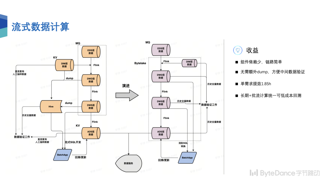 ● 其次,中间数据不落地带来的开发调试和数据测试困难的问题,需要额外起一个 dump 任务将数据落到 hive 之后才能做数据验证,周期比较长;