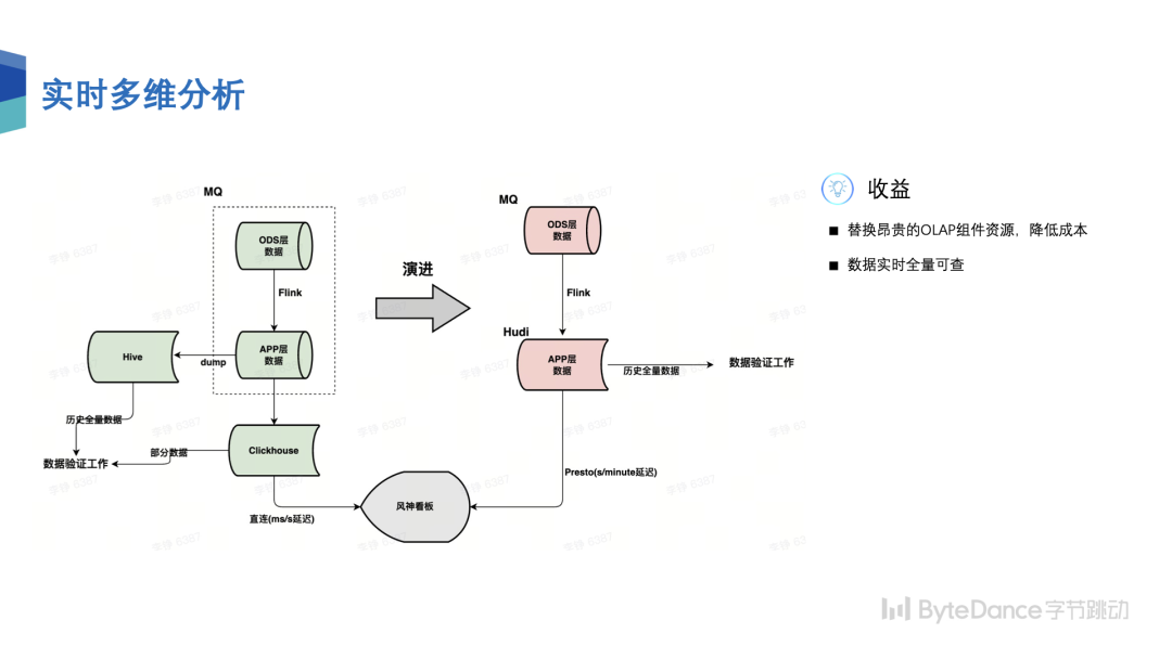 我们将链路中的依赖组件使用 Hudi 的湖仓一体表做改造之后,可以得到明显收益:环境依赖变轻,组件依赖少,链路简单;表既支持 Flink 流式消费、又支持批式读取,简化了调试验证工作,单需求提效明显;长期未来实现批流计算统一之后,实时离线状态可复用,也就低成本实现了历史数据回溯计算。/ 实时多维分析