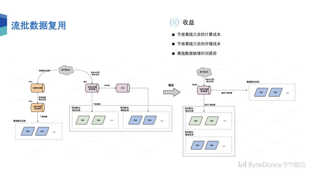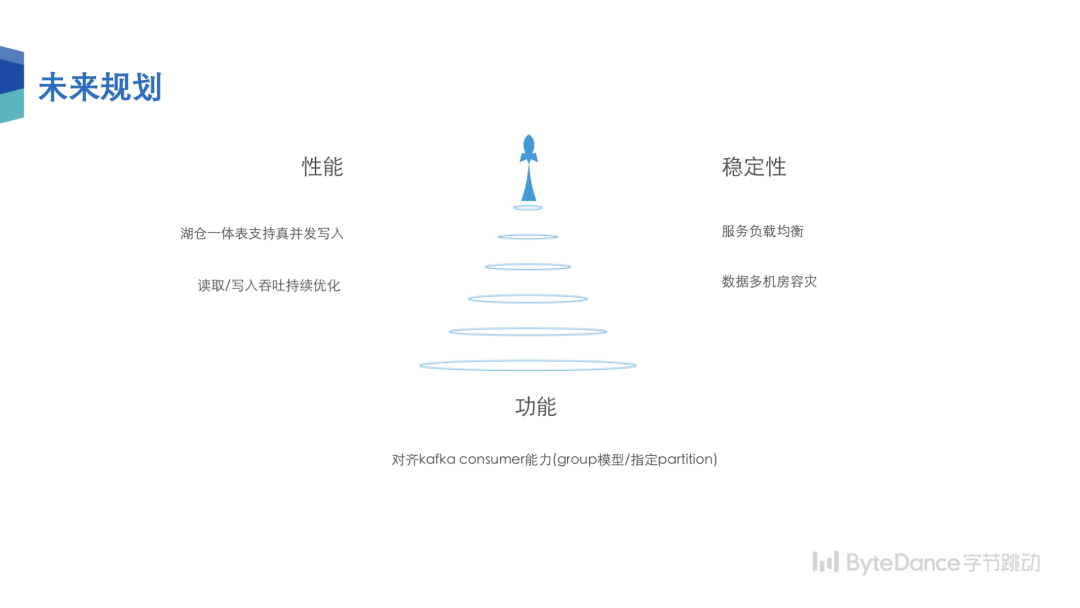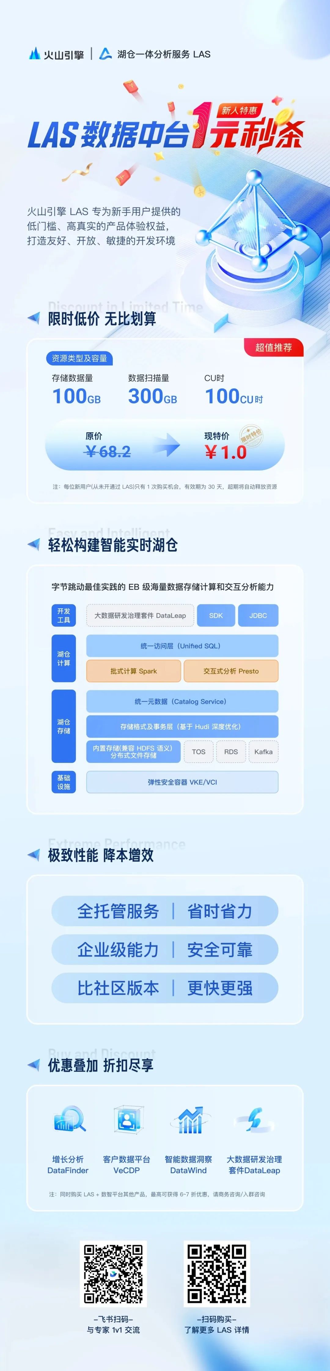 针对流批数据复用场景,实时数仓和离线数仓在原始数据层其实是依赖相同数据源的,以埋点数据为例,实时数仓和离线数仓都会基于客户端全量埋点数据,做依赖埋点、过滤产出 DWD 层,然后再基于埋点 DWD 数据做指标加工,埋点 DWD 层数据的建设需要两份计算和存储资源投入,且离线任务的计算集中在凌晨,资源被大量任务抢占时很难对任务按时拉起及保障数据产出时效性。通过将实时数仓中埋点 DWD 层数据的存储方式改成 Hudi 湖仓一体表,将表提供给离线数仓使用,此时收益体现在离线数仓的埋点 DWD 层数据不再需要额外投入计算和存储资源,此外,还能提升数据就绪时间。对于未来规划主要分引擎性能、稳定性和业务功能诉求三方面。首先,在引擎性能方面,计划实现能够支持多任务并发写入。通过多路 WAL 合并、异步 Flush、内存管理优化等手段不断提升写入/消费吞吐性能;稳定性方面,需要能够更好的感知服务节点,处理客户端读写请求的压力,提升服务负载 balance 的能力。实现服务支持多机房部署,支持数据多机房备份做容灾恢复;最后针对业务功能诉求,计划实现支持对标 Kafka partition 概念及 group consume 的能力。以上就是字节跳动内部自研的湖仓一体方案及其实践情况,目前均已通过火山引擎 湖仓一体分析服务 LAS 产品对外服务,欢迎对这方面有需求、感兴趣的用户都可以积极地来体验一下我们的 LAS 湖仓一体分析服务 。湖仓一体分析服务 LAS(Lakehouse Analytics Service)是面向湖仓一体架构的 Serverless 数据处理分析服务,提供字节跳动最佳实践的一站式 EB 级海量数据存储计算和交互分析能力,兼容 Spark、Presto 生态,帮助企业轻松构建智能实时湖仓。新人优惠来袭!赠送给所有新人用户的专属福利来啦,LAS 数据中台新人特惠 1 元秒杀活动最新上线!更有超多叠加优惠等你来抢!感谢大家一直以来对我们的支持与厚爱,我们会一如既往地为您带来更好的内容。(点击文末“阅读原文”,可顺滑体验)