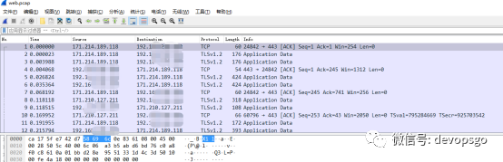 -w 是将输出内容保存到文件,而web.pcap是一个二进制文件,不能直接打开,可以通过 wireshark 软件进行分析。