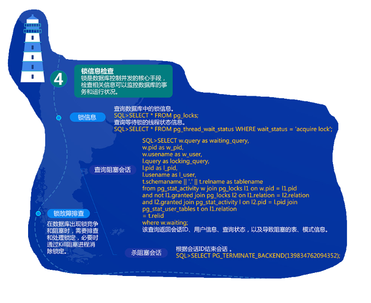 SQL>SELECT * FROM pg_locks;SQL>SELECT * FROM pg_thread_wait_status WHERE wat_status = 'acquire lock'SOL>SELECT w.query as waiting_query,w.pid as w_pid,w.usename as w_user,l.query as locking_query,l.pid as l_pid,l.usename as l_user,t.schemaname || '.' || t.relname as tablenamefrom pg_stat_activity wjoin pg_locks l1on w.pid = l1.pidand not l1.grantedjoin pg_locks l2on l1.relation = l2.relationand l2.grantedjoin pg_stat_activity lon l2.pid = l.pidjoin pg_stat_user_tables ton l1.relation= t.relidwhere w.waiting;