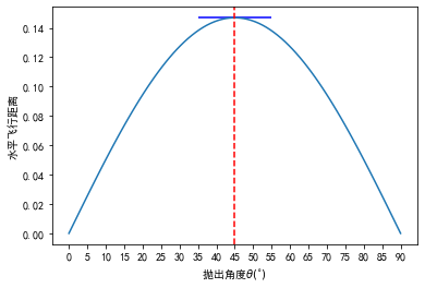 plt.xlabel(r'抛出角度$\theta (^{\circ})$')