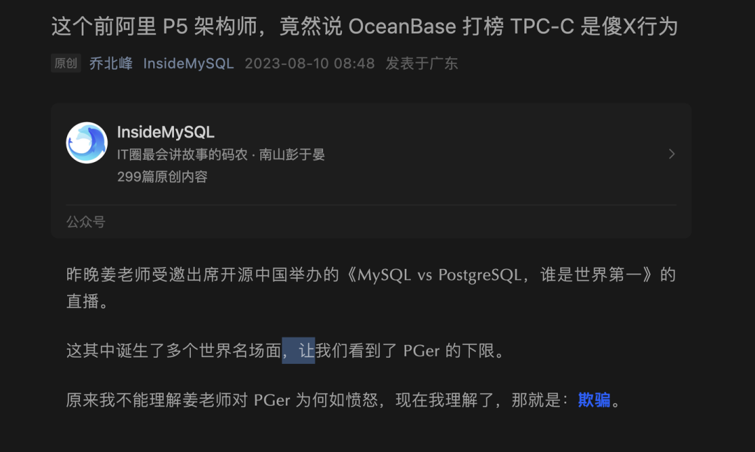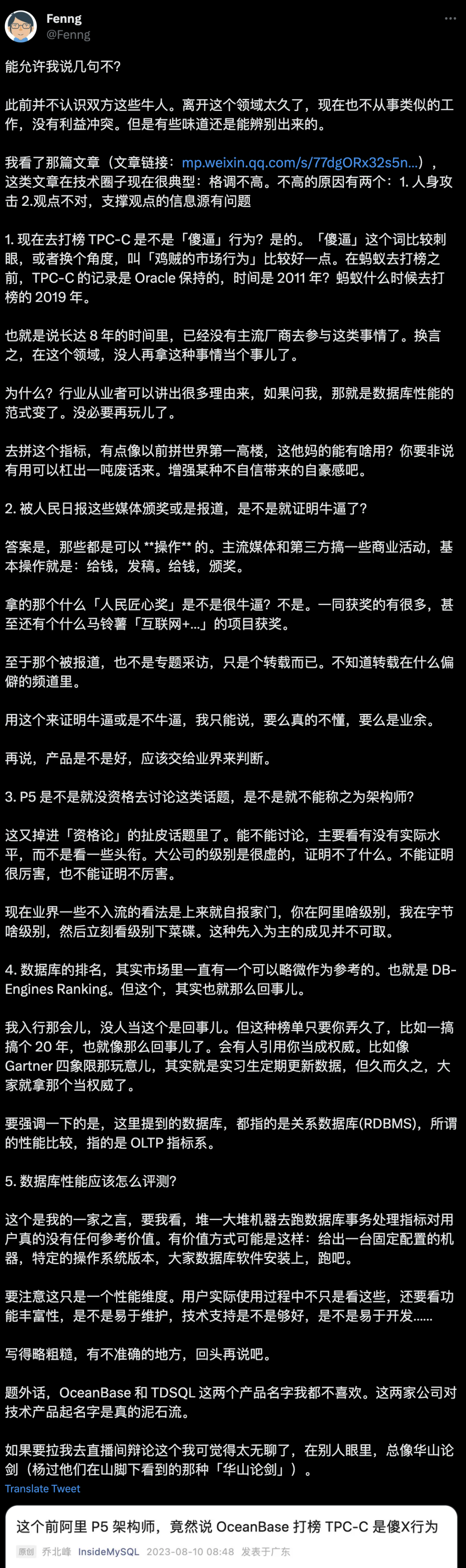 昨天辩论完后,姜的公众号还特意发了篇文章:《这个前阿里 P5 架构师,竟然说 OceanBase 打榜 TPC-C 是傻X行为》,继续人身攻击,因此在这里更新一些回应: