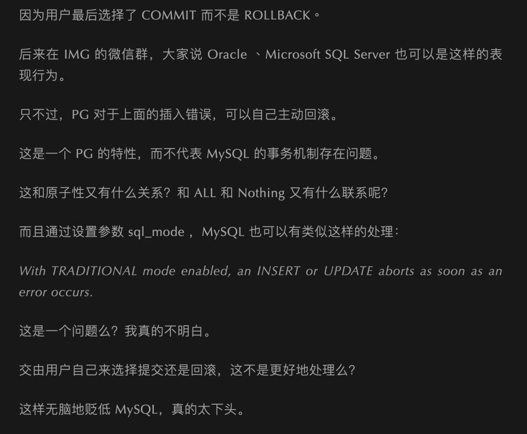 要求用户自己显式决定处理 COMMIT/ROLLBACK,等于把这一责任推卸到了开发者身上。如果这是一个 Bug 那还好,修复了就行;如果这是一个 Feature,那就是 Stupid by Design:默认允许用户做蠢事,除非显式配置。PostgreSQL 的哲学恰好相反,或者说,一个头脑正常的软件,它的设计原则都应当是:默认不允许用户做这种会导致数据错漏丢的蠢事,除非用户显式声明。考虑到 MySQL 的用户小白比例更高,这种原子性上的设计缺陷,以及隔离等级上的实现缺陷(参见:《并发异常那些事》),那么就更说不过去了。