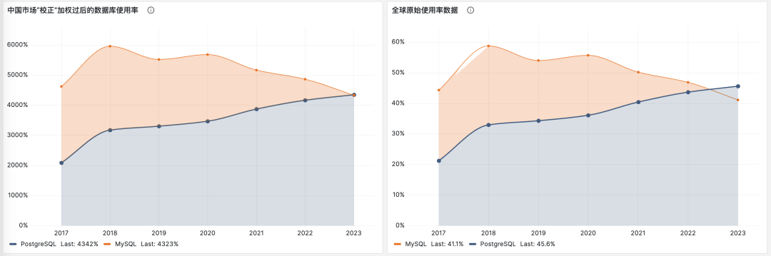 中国 PostgreSQL 使用率约为:2 * 43.35 * 1260 (1260 + 5283) = 16.7% ,中国 MySQL 使用率约为:2 * 43.35 * 5283 (1260 + 5283) = 70% 。