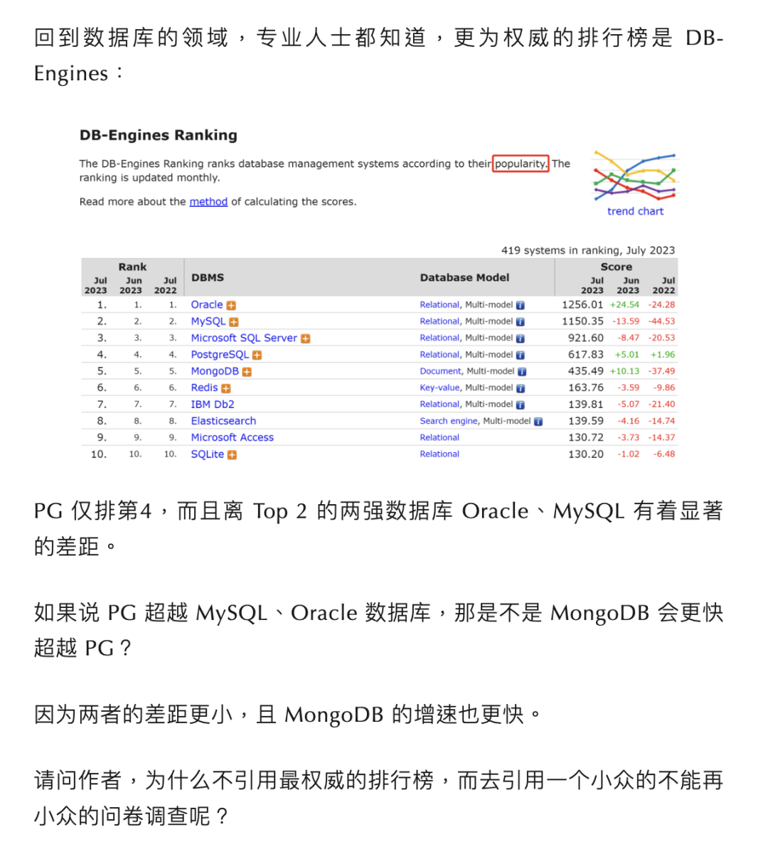 在文章的第一部分,作者又对 StackOverflow 问卷调研的可信度提出质疑,理由是有一个 “更为权威” 的数据库排行榜:DB-Engine 。而在 DB-Engine 排行榜上, MySQL (2nd)比 PostgreSQL(4th) 更高。