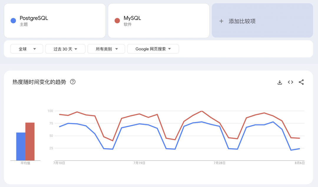 首先来看 Google Trends,搜索 PostgreSQL 与 MySQL 两个关键词,可惜 MySQL 没有“主题”类目,PostgreSQL 没有 “软件” 类目。我们按照下面的配置拉取最近 30 天的热搜数据。