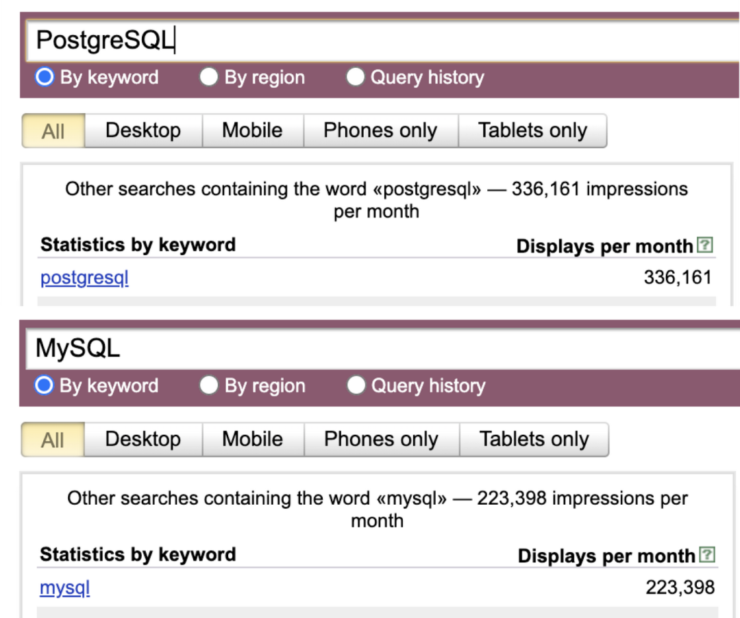 搜索引擎热搜数据具有一些局限性:首先:指数可以比较准确地揭示一个关键词本身的流行度趋势变化,但横向可比较性没有那么强。其次:你无法区分用户搜索的目的,究竟是因为喜爱支持,还是遇到了糟心的问题需要解决,最后:PostgreSQL 至少具有5种变体名称:pg, psql, pgsql, postgres, postgresql , 在 SEO 上相比 MySQL 天生处于劣势。