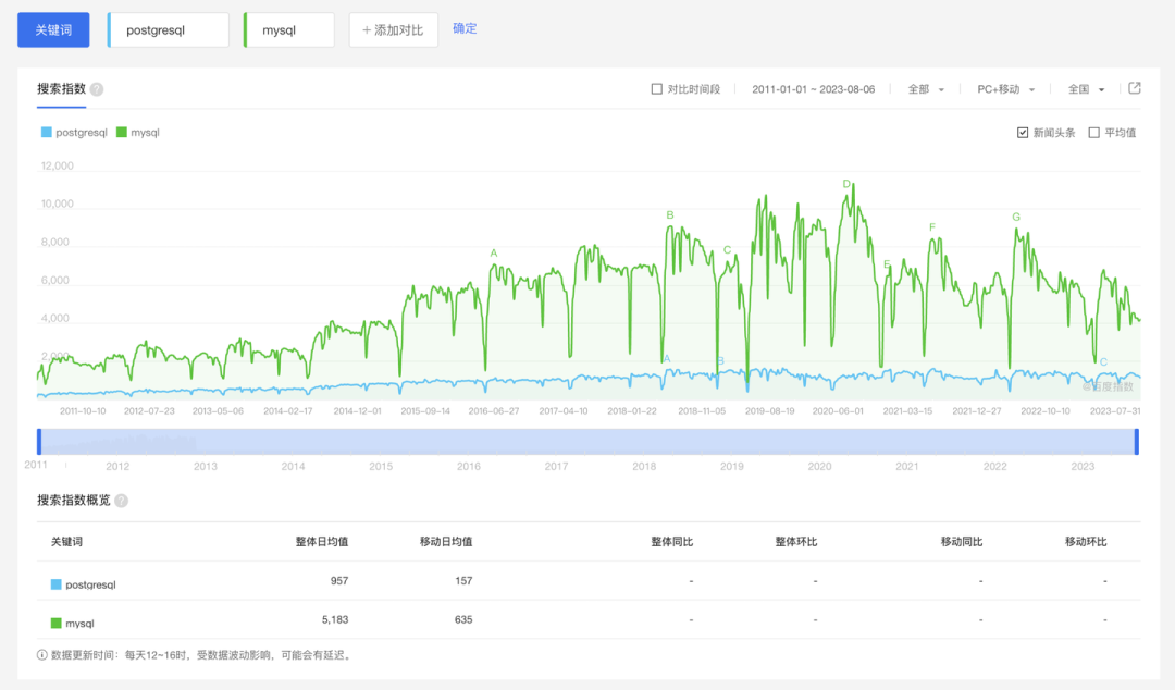 作者接着根据“搜索引擎数据”提出:全球 MySQL 流行度是 PostgreSQL 的 3 倍,在中国 MySQL 流行度是 PG 的 6 ~ 7 倍。我们上面已经说过了,搜索引擎热搜的数据无法推翻具有更强效力的问卷调研,但这不妨碍我们来看一看这些搜索引擎数据又能为我们带来什么新的洞察?