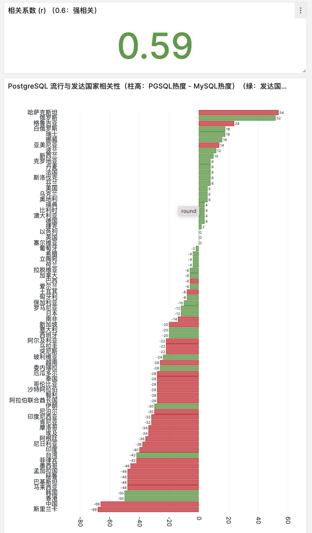 如果我们定量分析,PG - MySQL 热度差值与发达国家这个变量之间的相关性,会发现两者的相关系数高达 r = 0.6 ,踩在了强相关的门槛上。