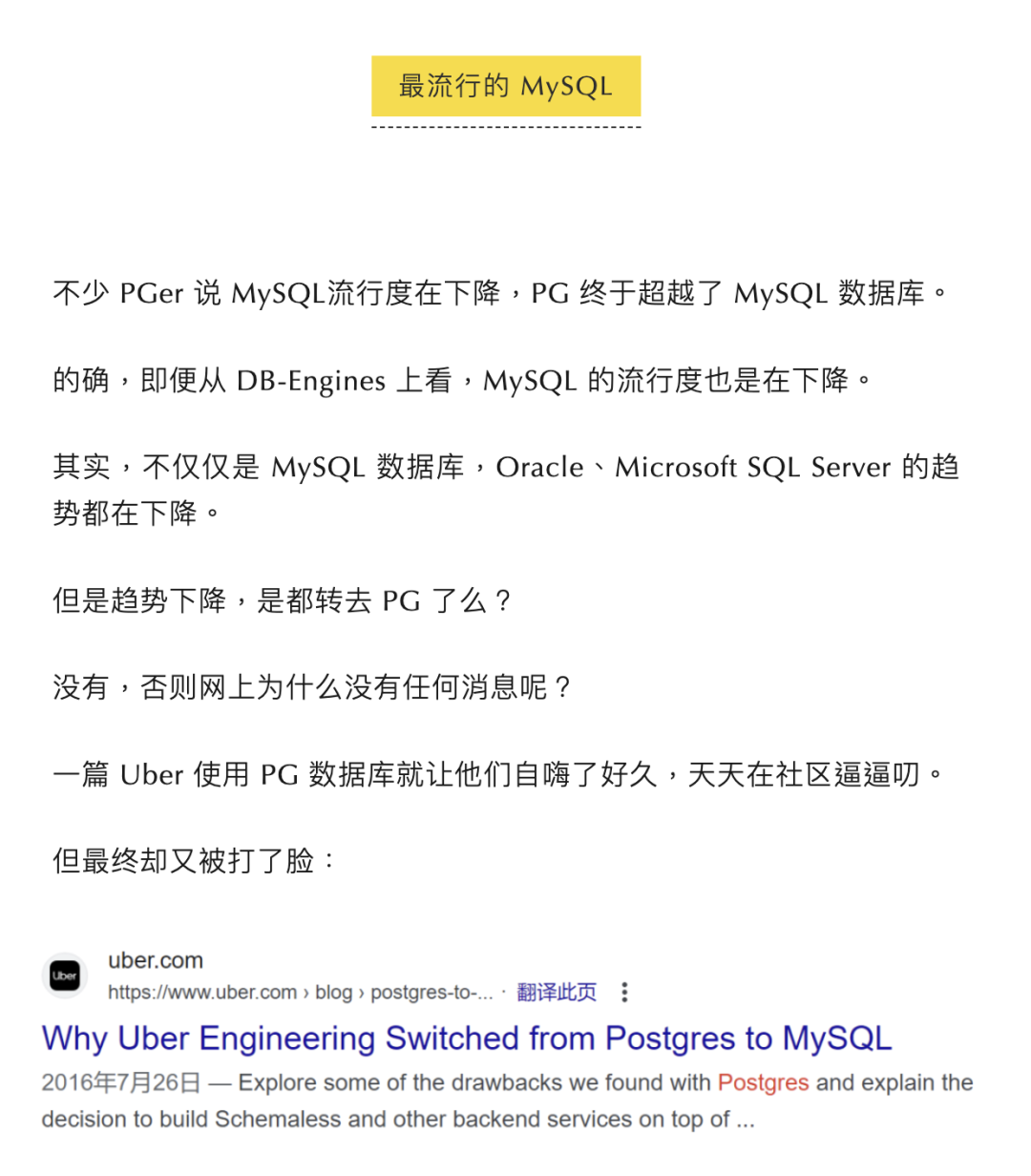 作者能够承认 MySQL 的流行度是在下降,这是不错的,但究竟是转去 PG ,还是其他数据库了呢?