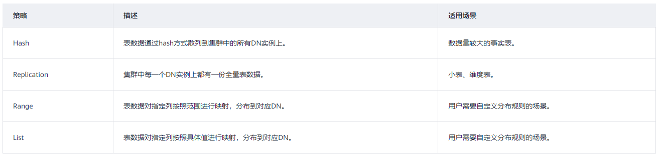 复制表(Replication)方式将表中的全量数据在集群的每一个DN实例上保留一份。主要适用于记录集较小的表。这种存储方式的优点是每个DN上都有该表的全量数据,在join操作中可以避免数据重分布操作,从而减小网络开销,同时减少了plan segment(每个plan segment都会起对应的线程);缺点是每个DN都保留了表的完整数据,造成数据的冗余。一般情况下只有较小的维度表才会定义为Replication表。