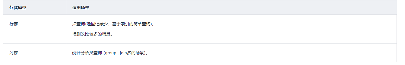 表的存储模型选择是表定义的第一步。客户业务属性是表的存储模型的决定性因素,依据下面表格选择适合当前业务的存储模型。