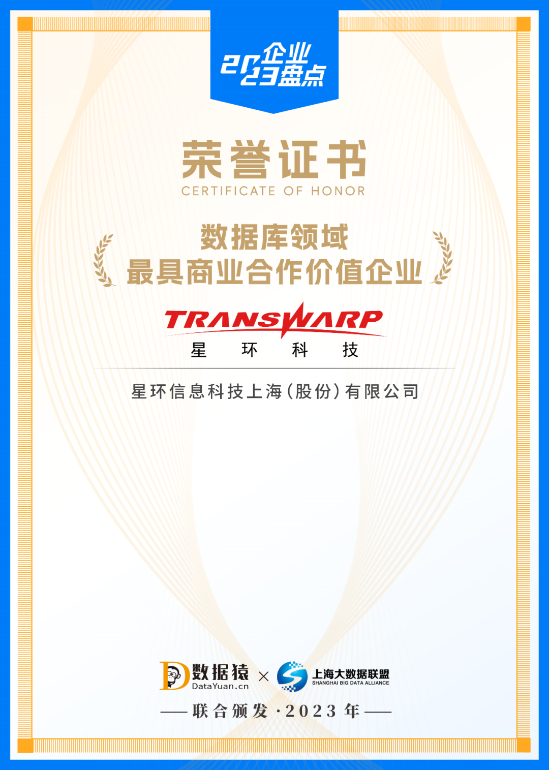 近日,数据猿联合上海大数据联盟发布了《2023中国数据库领域最具商业合作价值企业盘点》,星环科技凭借在数据库领域凭借的技术优势和实践经验荣获“2023中国数据库领域最具商业合作价值企业”。