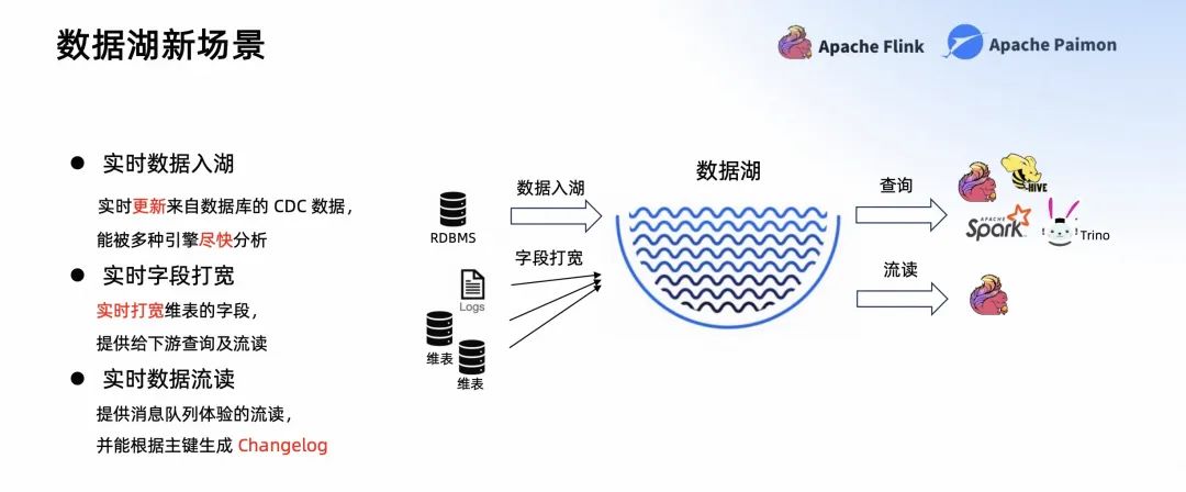 比如在 Paimon 0.4 中,我们提供了 Flink CDC 的入湖。原生集成的 Flink CDC 提供 DataStream 作业,通过 Flink CDC 把 Changelog 的数据通过 Schema Evolution 的方式写入 Paimon。