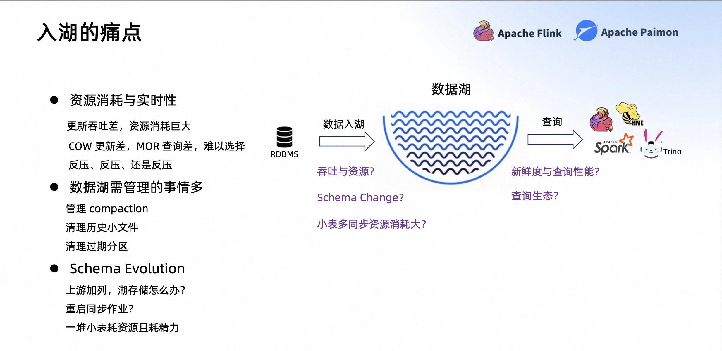 资源消耗与实时性:更新吞吐差,资源消耗巨大;COW 更新差,MOR 查询差,难以选择反压、反压、还是反压。 数据湖需管理的事情多:管理 Compaction;清理历史小文件;清理过期分区。 Schema Evolution:上游加列,湖存储怎么办?重启同步作业?一堆小表耗资源且耗精力。