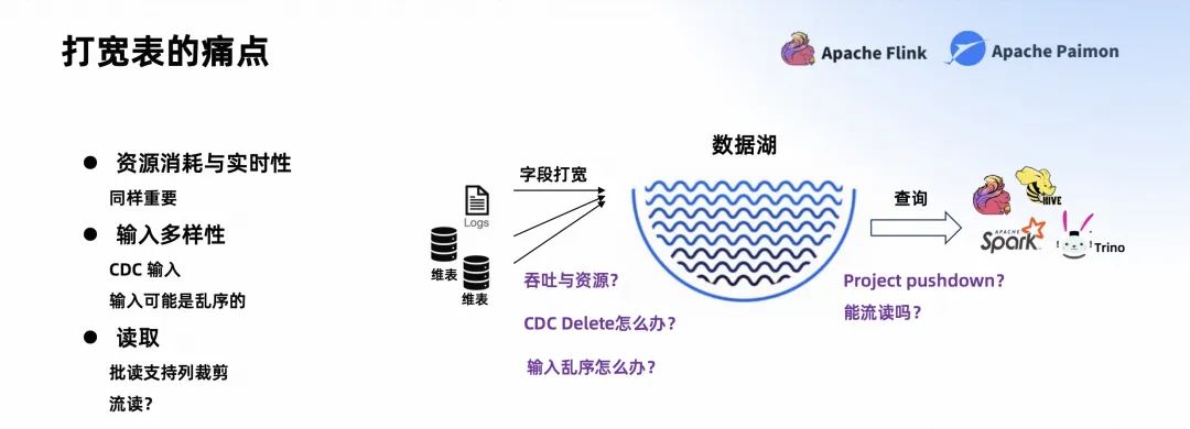 Paimon 支持定义 Partial-update,你可以定义 Partial-update Engine。这样就可以通过不同的留写入不同的字段,后面可以批读,甚至 Paimon 也提供了流读,只要声明 Changelog Producer 就可以流读合并后的数据,它的查询也支持列裁剪的高效查询。