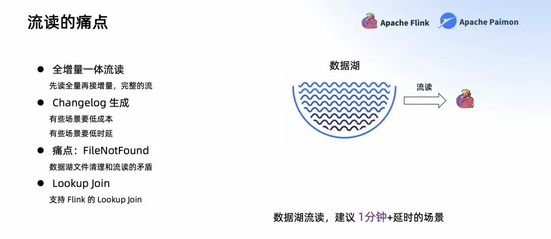 全增量一体流读:先读全量再接增量,完整的流,而不是只读增量。 Changelog 生成:有些场景要低成本;有些场景要低时延。 FileNotFound:数据湖文件清理和流读的矛盾。 Lookup Join:支持 Flink 的 Lookup Join。