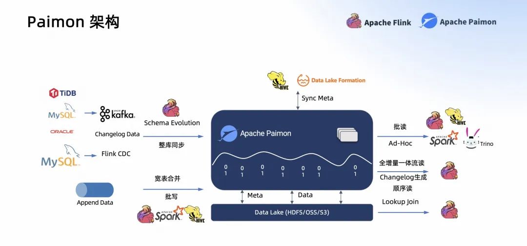 现在 Paimon 0.4 提供了 Flink CDC 的 Schema Evolution 同步,也提供了 MySQL 的整库同步,后续 Paimon 0.5 会支持 Kafka 的 CDC 数据同步。此外,我们还可以通过 Flink 将 Append 的 log data 通过批写的方式写入 Paimon 中,也可以通过宽表合并的方式写入 Paimon 中。
