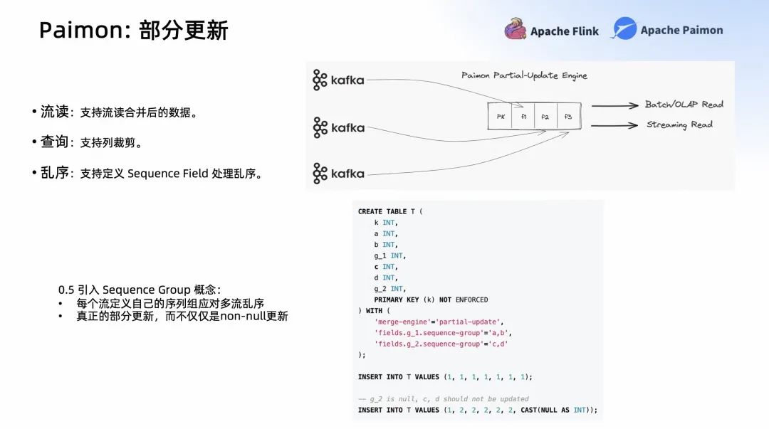 此外,Partial-update 的输入可能是乱序的,所以在 Partial-update 表,也可以定义 Sequence Field 处理乱序的情况。在 Paimon 0.5 中引入了 Sequence Group 的概念,为了解决每个流不同的乱序。如果它们共用一个版本字段,某个流更新之后有可能会导致另外一个流的最新版本不能更新。