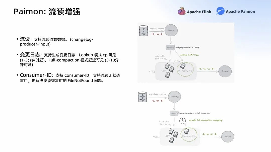 如果你的流不是一个完整的 CDC,比如 Partial-update 这种输入。所以就要求下游的流读要生成一个变更日志,在 Paimon 这里不仅支持生成变更日志,还有两种非常灵活的模式,Lookup 模式和 Full-Compaction 模式。