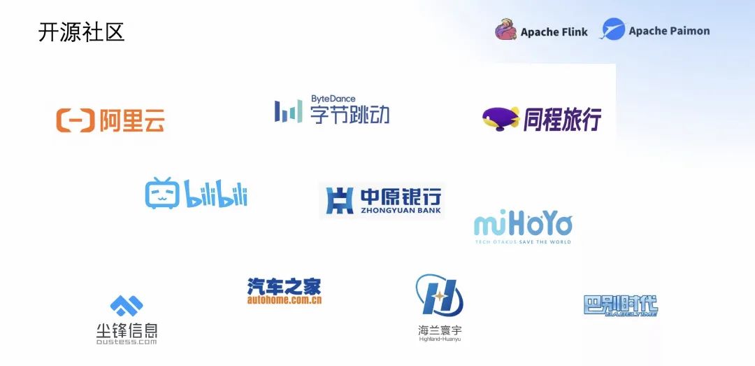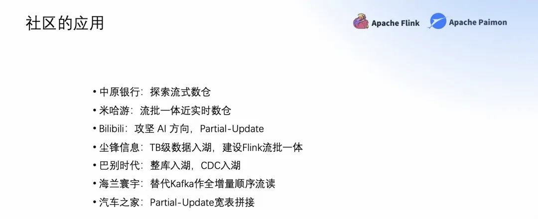中原银行在探索流式数仓;米哈游也在探索流批一体技术;Bilibili 在攻坚 AI 方向,考虑 Partial-Update 的场景;尘锋信息在探索 TB 级数据入湖,建设了 Flink 流批一体 + Paimon 的流批一体数仓等等。