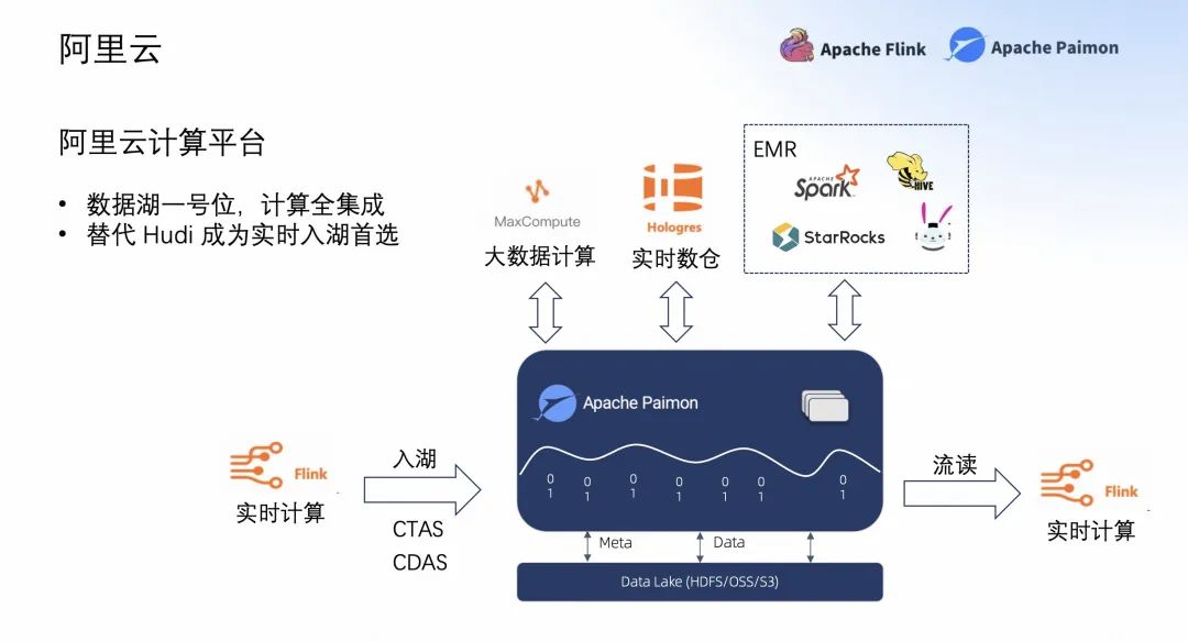 在阿里云计算平台,Paimon 是数据湖的一号位,希望阿里云计算平台的所有计算全部集成到 Paimon 中,集成 Paimon、读 Paimon。最好的集成是实时计算 Flink 版平台,它是 Flink 以及开源大数据平台 E-MapReduce 里面,希望替代 Hudi 成为实时入湖的首选。