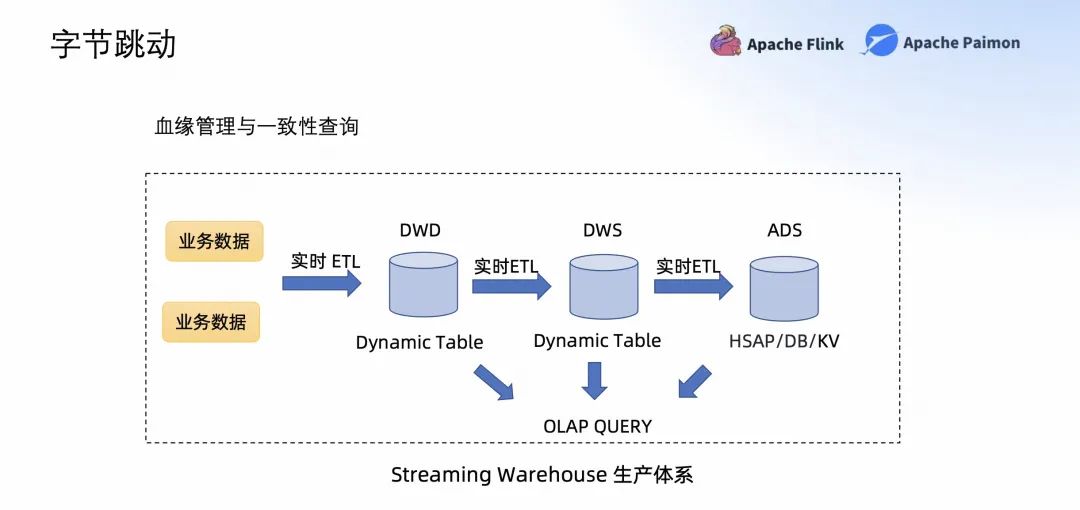 在字节跳动,工程师们使用 Paimon+Flink 作为血缘管理以及一致性查询的 Streaming Warehouse 生产体系。如上图所示,业务数据通过 Streaming ETL,类似于 Streaming materialize view 类似的概念,落到了 Streaming Warehouse 中。这样所有的 Paimon 表都能通过一致性的 Query 查询。