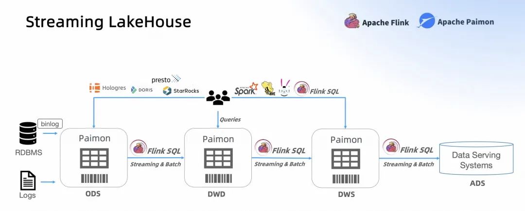 我们希望能达到这样一个 Streaming LakeHouse。数据通过非常方便的入湖能入到 Paimon 中,也能通过 Paimon 的流读和批读建立 Streaming 的 Pipeline。同时,Paimon 也应该有一个非常好的生态,能被各种引擎查询。这就是 Paimon+Flink 往后走的一个大方向。